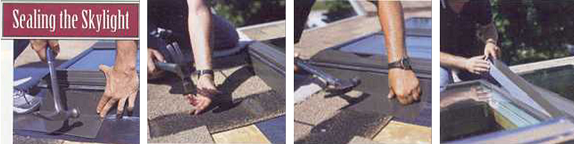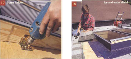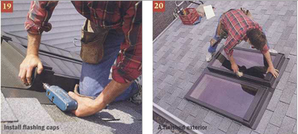 18. Ice and Water Shield. Now you’ll want to install an impermeable ice and water shield all the way around the skylight (see page 38). Start from the bottom and work your way to the top to create an overlapping waterproof barrier. It goes up most of the side of the skylight and under the layer of shingles. “This stuff bonds like crazy. Once the sun hits it, nothing will get it off,” says Charron. For tile roofs or other uneven surfaces, you’ll need to get a flexible lead apron. When you install the flashing, also working from the bottom on up, be sure you nail it into the skylight frame only, and not into the roofing boards. Start with the bottom piece and then work your way up the side with L-shaped step flashing – lay down the flashing, overlap with a shingle and attach another flashing piece. Make sure that you don’t nail through the flashing when reattaching the shingles.