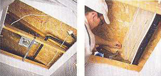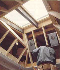 The first job was to mark and cut out the ceiling opening. In this case it was easier to access and work on the plumbing from the bathroom rather than the attic since the space between the ceiling and the roof was tight and it was over 100° in the attic that day. It all took a couple of hours. As it turned out they made up the lost time since no rafters needed to be cut-the skylights could be centred over the bathroom and positioned side by side, fitting between the rafters-and only two new headers were required to reinforce the rafters and support the skylights at the top and bottom.