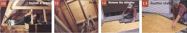 • Charron uses an old piece of carpeting to kneel on when he’s up on the roof. Reuse any joist rafters you may have to cut for braces.