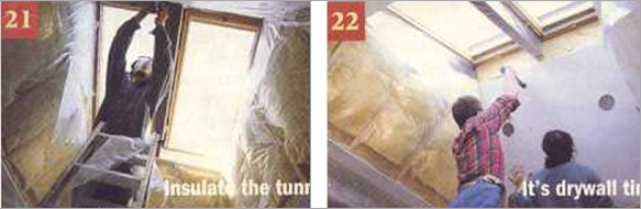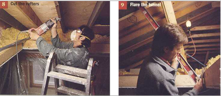 8. Cut the Rafters. Build temporary supports around your rafters before you cut them. “A lot of the wood you remove can be reused for the headers,” says Charron. “In fact, I prefer to use it because it’s already dried up and won’t warp.” Not to mention saving some money and a tree. To support the skylight and cuts to the rafters you need to build a frame of doubled up 2’ x 6’ all the way around your exterior roof as you did on the interior ceiling (see photo 11 for a good view of the new framing). Secure the corners with joist hanger brackets. At this point you can cut out the roof and start installing the skylight or you can work on the tunnel.
