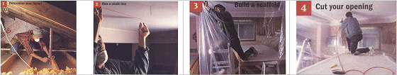 3. Build a Scaffold. You can work from ladders but it’s much safer and easier to work from a scaffolding – you can make your own like Charron and Milloy did, or you can rent one. Setting up a tarp to keep the insulation and sawdust contained is a good idea. Here Milloy tacks up a tarp from the ceiling to the base of the scaffold. It contains blown insulation and drywall dust and makes clean-up a lot easier.