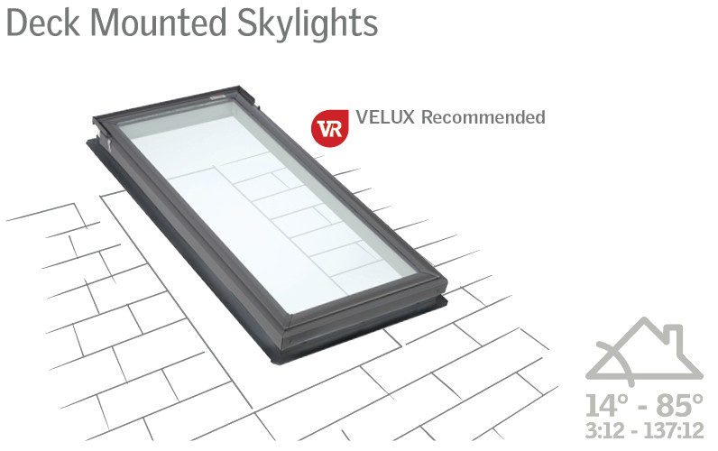 Deck Mounted Skylights (usually with glass lenses) are attached directly to the bare roof deck sheathing. In the case of Velux, their frames are made of wood and designed to mate with drywall on the interior. Curb Mounted Skylights are placed like a cap on top of a constructed box-like structure called a curb, therefore making it higher off the roofline. Curb Mounted Skylights are excellent for replacements because they are more compatible with existing hole sizes. Curb Mounted Skylights also have more glass area when compared to the equivalent Deck Mounted size.