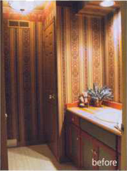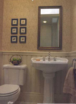 To reflect the country charm of the home, ready-to-install, pre-primed MDF wainscoting panels by Stinson Wainscoting were installed and painted in a delicate pastry colour to match the leafy print of the wallpaper dressing the walls above. Reasonably-priced fixtures – pedestal sink and toilet – were put in with chrome taps by Price Pfister picked up at Rona/Lansing. A clear glass shower enclosure by Shower Door of Canada give the appearance of a walk-in shower and enhances the light and airy feel of the new room.