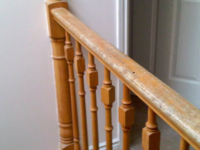 This is the damage from an old dome skylight on the stairway railing in a house located in Stouffville. Dome skylights give very little UV protection (UV is what fades things). Most dome skylights are made of 2 layers of acrylic in the shape of a dome. They are usually sealed one to the other with neoprene gaskets or butyl tape. Unfortunately, they cannot be sealed tight enough to create a vacuum in the same way as 2 layers of flat glass can be sealed. Because they cannot be perfectly sealed, argon gas cannot be injected between the 2 domes. It's the argon gas that is injected between the 2 layers of flat glass skylights that gives the higher level of UV protection. Besides causing fading damage, domes also tend to create a lot of heat in the summer.