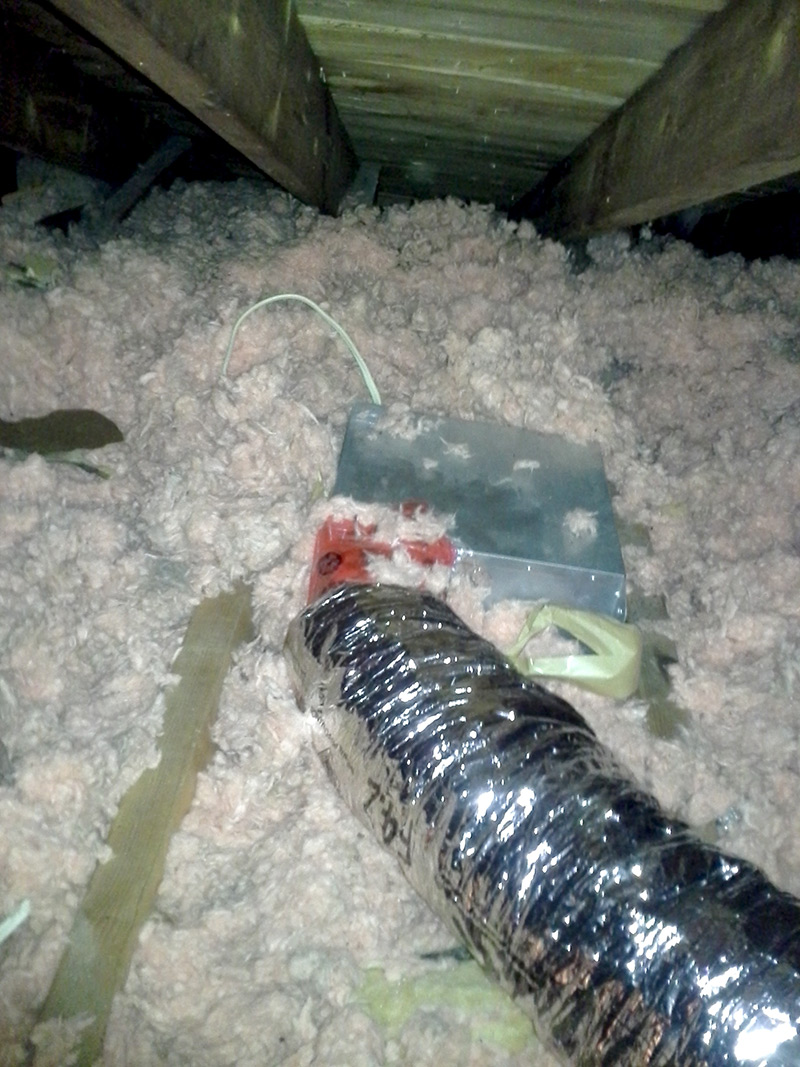 This is an example of the right kind of duct work to use for bathroom exhaust fan systems. The duct work is an insulated pipe with an aluminum exterior skin.