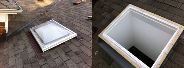 This old dome skylight had come to the end of its life and was leaking, also it was of an uncommon size that was no longer available. We recommended a custom sized energy efficient LowE3 glass skylight. This also gave us the opportunity to insert some foam panels into the framework (curb) of the skylight. This framework is usually only a 2x6 or 2x4 spruce frame..... poor insulation value!