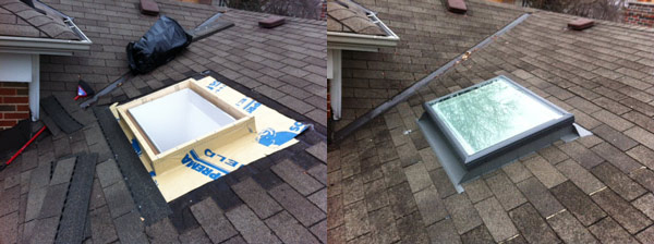 This is an example of an energy efficient Velux LowE3 glass skylight on a flat roof. Because the glass is flat (as opposed to the dome shape) we prefer to install these skylights on a slope so that they shed the snow and the rain effectively. The original tar and gravel roof was not in great condition as can be seen by the dark areas, but would be getting re-done in the next couple of years. The skylight curb was sealed in to the tar and gravel roof by using a 2 ply torch down membrane giving the insulation a 20 to 30 year lifespan.