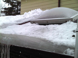 This is an extreme case of ice damning below the skylight. Sometimes the heat escaping from a poorly insulated skylight will cause the snow to melt and form as ice on the roof below the skylight.