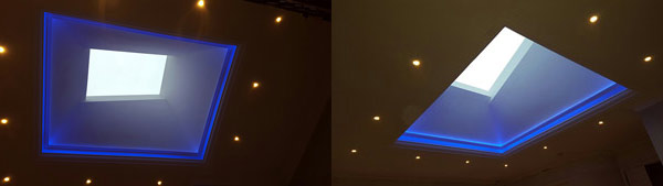 This is a new sky installation in Thornhill. WE installed a 4x6’ fixed velux skylight with LowE 3 glass and built a tunnel flared in 4 directions (like a pyramid) to a ceiling opening of 7’x9’. Around the base of the ceiling opening we installed a light cove moulding with coloured LED rope lighting inside. This lighting changes colours by remote control (seen here with blue light). This creates a very dramatic effect in the customers foyer area.