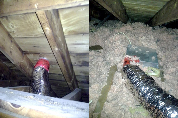 This allows for the hot air from the bathroom to go thru the pipe and to be exhausted to the exterior without putting any heat or humidity in the attic space…….that would cause a lot of mold. Notice that the piping is well sealed to the fan with tuck tape as well as sealed to the direct connect roof trap.