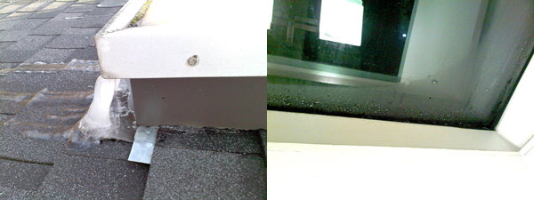This is an example of a skylight drainage system working properly. This Velux curb mounted glass skylight’s condensation drainage system is allowing any condensation that forms on the inside of the glass, to drain properly to the exterior. In cold weather, this continuous slow drainage of condensation, forms like an icicle.