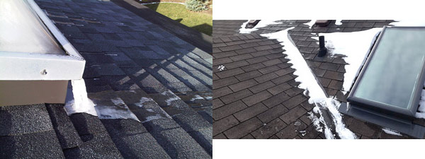 This case is an extreme example of ice damning from heat loss. The heat loss is not only from an inefficient skylight but its also because the insulation in the attic space around the skylight was very minimal. This was caused by the skylight installer when he built the light shaft through the attic space, for the skylight. He neglected to insulate the tunnel walls and he didn't do a good job of replacing the ceiling insulation adjacent to the skylight tunnel. All the heat from the house, easily radiated into the attic space and the underside of the roof, melting all the snow and causing the ice damning.
